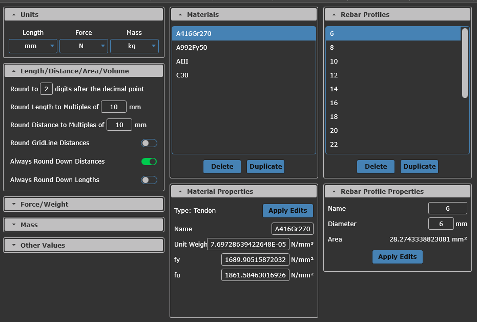 Ability to add new reinforcement bar sizes or modify existing bar specifications.