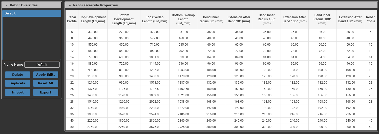 Capability to modify reinforcement development details (e.g., development length, bend extension, etc.) or import them directly from Excel files.