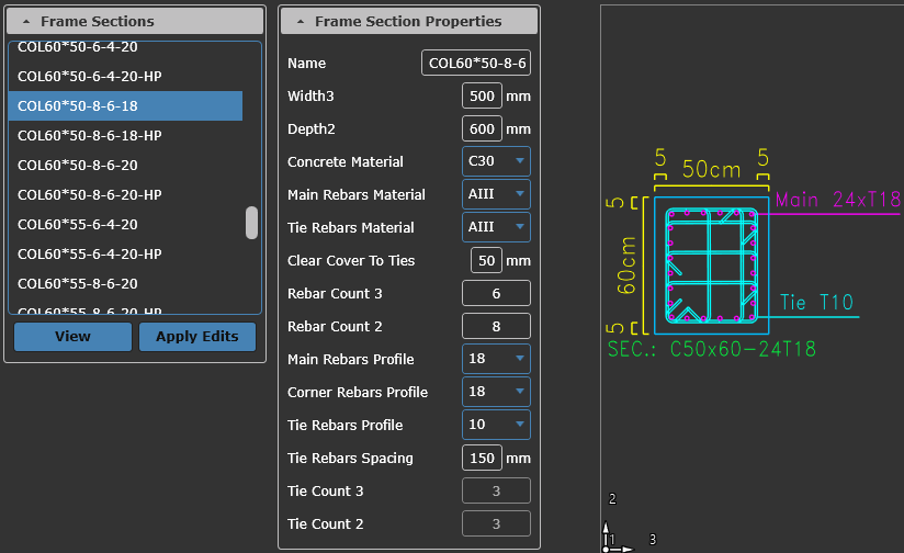 Ability to view and edit beam and column cross-sections within the software.