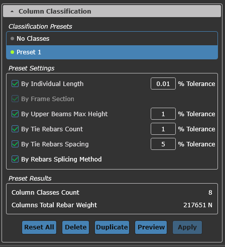 Real-time display of reinforcement weight during column classification.