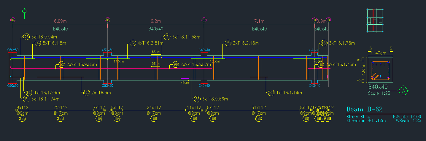 Generation of detailed beam drawings with full reinforcement specifications.